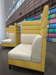 また、3,4階にはカラフルな椅子や仕切りのない机等が並んでいる一方、2階の席には集中に特化されたBOX席的なところが存在します!また、読書に特化した席も…!非常にリラックスして読書、作業ができる空間となっていますね!