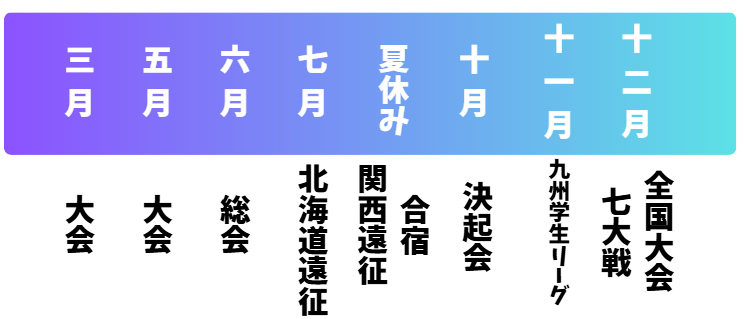 3月、5月に学生大会があって、11月には、目標として優勝を掲げている九州学生リーグがあります。